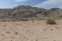 there are mountains in the background of this desert landscape, with grass and weeds surrounding them