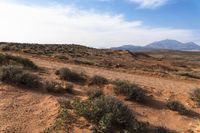 A rugged landscape in Utah, USA, featuring red rock formations and a desert terrain. Dirt roads wind through the mountainous terrain, surrounded by grass and vegetation. A perfect day for off-road adventures in nature.