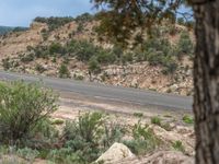 Aerial view of an asphalt road winding through the rural landscape of Utah. The road is elevated and positioned high, offering a panoramic view of the mountains and natural surroundings. Clouds fill the sky on this clear day.