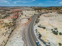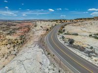 An aerial view of an elevated road in Utah, surrounded by rural landscape. The road cuts through the scenic Head of the Rocks area. Clear skies provide a breathtaking backdrop.
