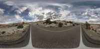 a wide angle of a road in the desert with the sky partially partly cloudy and no cars