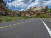 A road in Utah stretches through the landscape. The asphalt blends with the natural surroundings. Clear skies and fluffy clouds create a serene backdrop. A perfect day for a scenic drive in the USA.