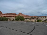 A day in Utah's canyon landscape, with asphalt roads cutting through nature. Clouds fill the sky over a parking lot. The surface of the road reflects the natural beauty of the USA.