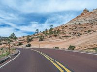 A road stretching through the majestic landscape of Zion National Park in Utah, USA. Clear skies and fluffy clouds provide the perfect backdrop to the stunning mountains. A perfect day in nature.