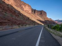 A road leading through the canyon landscape of Utah and Colorado River. The hard shadow from the dawn breaks the clear sky. Nature's beauty on display in the USA.