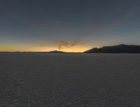 A serene landscape in Utah at dawn. The dark sky gradually transitions into a clear and calm atmosphere. The mountains stand tall against the desert and the surface of the salt lake, creating an emotional and peaceful scene.