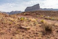 This is an image of the Utah desert landscape in the USA. The red rock formations and rugged terrain create a stunning backdrop. The grassy surface contrasts with the sandy desert floor and rocky bedrock. In the distance, a road winds through the canyonlands, leading adventurers to explore the off-road tracks. The vegetation adds a touch of green to the otherwise arid surroundings. The clear blue sky and fluffy clouds complete the picturesque scene. This photo captures the untamed beauty of the highlands in Utah, a perfect representation of nature's grandeur.