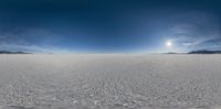 a photo taken from inside of a snow field showing the sun in the sky and the horizon