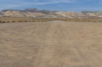 A scenic drive through Utah's desert landscape. The red rock canyons of Canyonlands National Park make for a stunning backdrop. The dirt road winds through the mountains, with vegetation and grassy plains on either side.