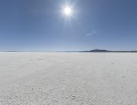 This stock photo showcases the beautiful natural environment of Utah. In this image, someone walks across an open desert plain with soft sands, surrounded by breathtaking mountain views. The sun is shining brightly, casting a warm and inviting light over the landscape. The clear blue sky and calm sea of clouds create a serene and peaceful atmosphere. In the distance, you can see the stunning horizon and the visible sun adding a touch of emotion to the scene. The dry and sunny weather, along with the salt surface of the nearby salt lake, contribute to the unique charm of this Utah desert landscape.