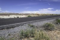 This image captures the rugged and breathtaking landscape of Utah, USA. A stretch of asphalt road winds through the desert, surrounded by majestic mountains and lush vegetation. The clear blue sky is adorned with fluffy white clouds, leaving contrails behind. The vibrant red rock formations of Goblin Valley and San Rafael Swell can be seen in the distance, creating a stunning contrast with the green grass and plain. This photo showcases the natural beauty of Utah's canyonlands and highlights the harmony between nature and human-made infrastructure.