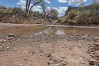 This is an image of a desert landscape in Utah, USA. The red rock outcrops and rugged terrain create a stunning natural scenery. A dirt road and off-road tracks are visible, reflecting the nature of this remote location. The clouds in the clear sky above add depth to the image. In the foreground, there is a reflection of water resources, including a reservoir, wetland, and creek. The erosion process can be observed in the canyons and lacustrine plains. This photo captures the diverse ecosystem and beautiful features of the Beef Basin region in Utah.