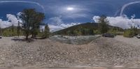Utah desert landscape with a river cutting through rocky terrain. Sun shines brightly on the open space, highlighting the green grass and sandy surfaces. Clouds drift above, contrasting with the clear blue sky.