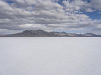 This image captures the stunning landscape of Utah, USA. The snowy plain stretches endlessly, with majestic mountains in the background. The clear blue skies and fluffy white clouds create a picturesque scene. In the distance, the Bonneville Speedway can be seen, a famous landmark in the area. The natural environment of this desert region is showcased beautifully in this photo, with the vast open spaces and pristine wilderness. This is a perfect representation of the highlands and mountain ranges of Utah, with Salt Lake City and the salt lake itself adding to the charm.