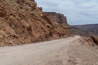 A rugged off-road track in Utah's desert landscape. Red rock formations and rock walls create a stunning backdrop. The road surface is a mix of dirt, gravel, and bedrock, leading to the majestic Canyonlands.