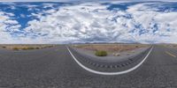 a fisheye lens view shows a desert road in a circle with a mountain in the distance