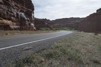 a person riding a motorcycle along a narrow road through rocks and sand cliffs a grassy area on both sides