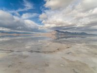 A scenic landscape in Salt Lake City, Utah, showcasing open desert spaces with mountains in the background. Sun visible in clear skies over the salt flats. Perfect sunny day for nature lovers.