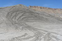 A rugged desert landscape in Utah, featuring red rock formations and a vast expanse of sand. Clear sky highlights the high terrain and elevated curves. Explore the off-road track through the stunning formation of San Rafael Swell and Factory Butte at Swing Arm City.