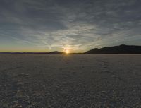 Utah's stunning desert landscape bathed in the warm glow of the setting sun. The calm atmosphere and clear sky create a serene and emotional scene. The sun visible over the horizon adds to the beauty of the mountainous backdrop.