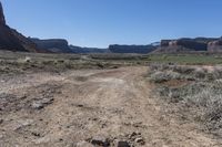 A rugged dirt road winds through the stunning landscape of Utah. Red rocks and mountains dominate the scene. The clear sky adds to the natural beauty of the desert wilderness.