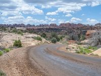 Off-road adventure in the stunning landscape of Utah's canyons. A dirt road winds through the untamed nature, surrounded by sand and gravel streets. Clouds fill the sky on this beautiful day in the USA.