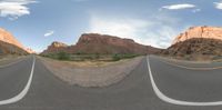 two roads in a desert are seen by a 3d man riding a skateboard on the road