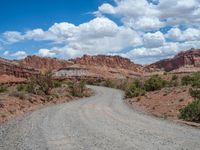 An off-road track in Capitol Reef, Utah. The gravel street leads to a sandy path, surrounded by the stunning Utah landscape. Clouds dot the clear sky on this beautiful day.