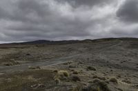 a dirt road and dirt hills during a cloudy day with dark clouds above them, in a remote area