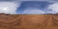 a dirt track with rocks and mountains in the distance and clouds in the sky and clouds overhead