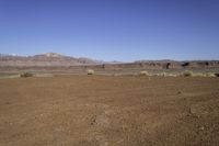 This is a photo of the stunning landscape in Utah, USA. The image captures an open desert with rugged mountains in the distance. In the foreground, there is a small patch of grass amidst the desert terrain. The clear sky above accentuates the beauty of the desert and the rock walls surrounding it. This photo perfectly depicts the natural beauty and vast open space of Utah. It showcases the unique combination of the desert, mountains, and grassy patches. The image represents a typical day in the desert region of Utah.