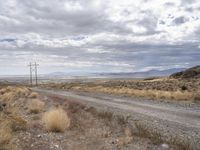This is an image of an open field in Utah, USA. The dirt road cuts through the landscape, with overhead power lines running alongside it. In the distance, the rugged mountains provide a stunning view. The grey sky overhead adds to the atmosphere of the scene. This photo captures the vastness and beauty of the rural landscape in Utah. The endless road and dryland surroundings create a sense of solitude and tranquility. It's a perfect representation of the natural environment in this region.