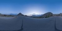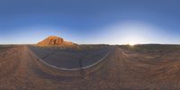Open space in Utah at dawn, the break of day casting hard shadows on the asphalt road. Curves in the landscape under a clear sky with the sun visible. A sunny dawn in the USA.
