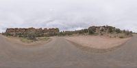 Utah landscape at dawn, showcasing an open space with gravel and sand streets. The clear sky contrasts with a gloomy grey sky, casting hard shadows on the dirt surfaces. Nature's beauty under the break of day in the USA.