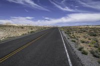 This image showcases the natural beauty of Utah, USA. The photograph captures a vibrant landscape with a winding asphalt road cutting through the desert. Majestic mountains in the background provide a stunning backdrop, while the grassy plain and cloud-dotted sky add to the serene atmosphere. The road surface is smooth and well-maintained, leading towards the horizon. In the distance, the San Rafael Swell and Canyonlands can be seen, displaying the iconic red rock formations. This photo perfectly represents the unique and breathtaking scenery found in Utah's Goblin Valley.
