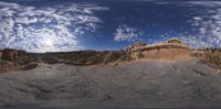 Utah's vast landscape under a sunny sky, showcasing open spaces with rock, dirt, and gravel surfaces. Hard shadows play on the sandy ground. The sun visible casts a warm glow on the nature-filled scenery.