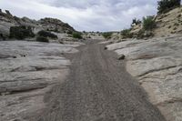 the gravel road goes over a rocky cliff face to some rocks below it and into the canyon