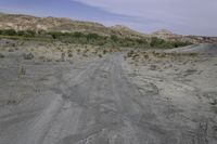 a dirt road with some trees on both sides of the dirt and hills, some bushes in the middle of the road, and there are dry grass on each