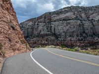 A scenic landscape in Utah, USA. The road stretches into the distance, lined with asphalt under a clear blue sky dotted with fluffy clouds. Nature surrounds the road, creating a picturesque view.