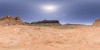 a desert area in the distance is seen from a fish eye lensed view of a bright sun