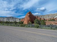 A scenic road that winds through the beautiful Kodachrome Basin State Park in Utah. Clouds dot the clear blue sky as it merges with the stunning natural landscape. A perfect day to explore the wonders of this road trip destination.