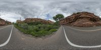an image of a road on a cloudy day in this mirror image made with a fisheye lens