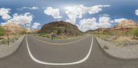 a 360 - shot of a highway in the mountains below some trees and a rock formation