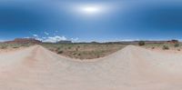 An open space in Utah at dawn, with the sun breaking through the grey sky. The landscape features dirt and gravel areas contrasting with green grass and rocky surfaces.