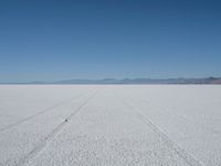 An open space near Bonneville Speedway in Utah. The clear sky and desert landscape create a picturesque scene. Tire tracks on the salt surface lead to the majestic mountains in the distance.