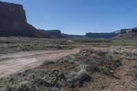 A rugged dirt road winds through the barren landscape of Utah, surrounded by majestic mountains and towering red rock formations. The clear blue sky overhead adds to the breathtaking beauty of the canyonlands.