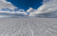 This stunning image showcases a wide snowy plain in Utah, USA, under clear blue skies. The majestic mountains in the background create a breathtaking backdrop for the open space. The clouds in the sky above add a touch of drama to the scene. This nature landscape captures the beauty of Salt Lake City, known for its salt lake and dramatic surroundings. Perfect for illustrating the beauty of the Utah desert and its natural wonders.