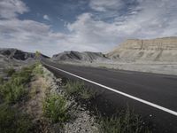 This is an image of a deserted road in Utah, USA. The road, made of asphalt, winds through the low desert landscape and is surrounded by mountains. It is a bright sunny day and there are scattered clouds in the sky. The road surface is visible and in good condition. The highway cuts through the mountain pass and offers stunning views of the highland nature. This photo captures the beautiful landscape and the infrastructure that connects the mountainous regions of Utah.