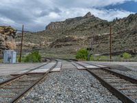 A straight road cutting through the picturesque landscape of Utah. The road stretches ahead, surrounded by mountains and clouds. A train is seen on the nearby railway, adding to the natural beauty of the scene.