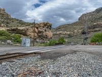 A scenic landscape in Utah, USA, with a road winding through the mountains. Clear skies and fluffy clouds create a perfect day for outdoor exploration. The road runs alongside a railway, showcasing the beauty of nature and infrastructure.